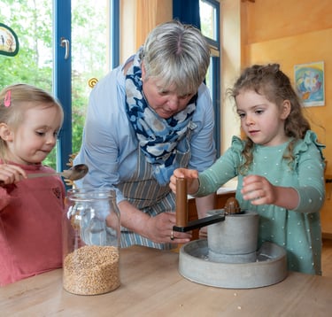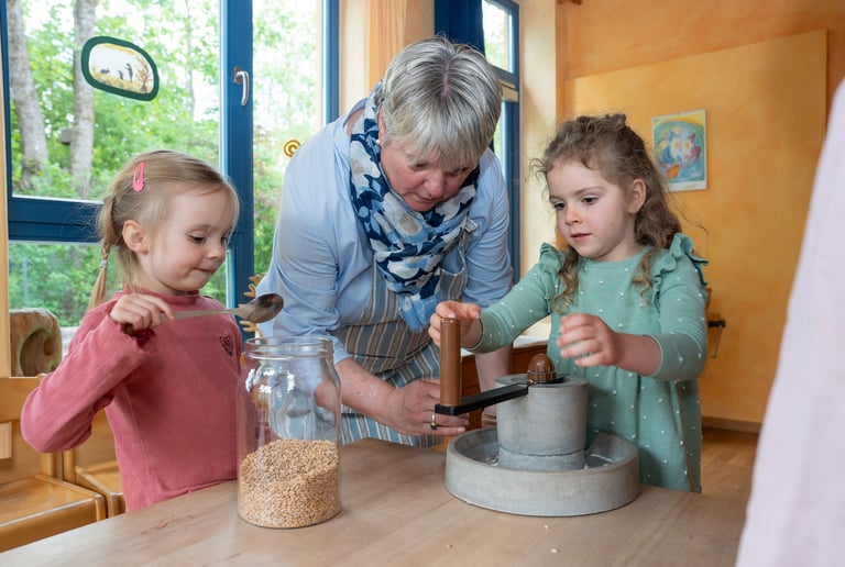 Kinder bis etwa sieben Jahre lernen hauptsächlich durch Nachahmung und Sinneserfahrungen. Sie entwickeln grundlegende Fähigkeiten wie Gehen und Sprache sowie soziale Kompetenzen durch Beobachtung und Nachahmung. Sie nehmen alles wertfrei an und ahmen nach, was in ihrer Umgebung gesagt, getan, gedacht und gefühlt wird. Daher spielen authentische und liebevolle Bezugspersonen, insbesondere unsere Erzieher/innen, eine entscheidende Rolle. Die Kinder werden von unseren Erzieher/innen aktiv in alltägliche Handlungen wie das Zubereiten von Mahlzeiten und Aufräumen einbezogen. Durch das Beispiel unserer Erzieher/innen lernen die Kinder, sich in Gemeinschaften zu integrieren, Verantwortung zu übernehmen, Rücksicht zu nehmen und Konflikte zu lösen.