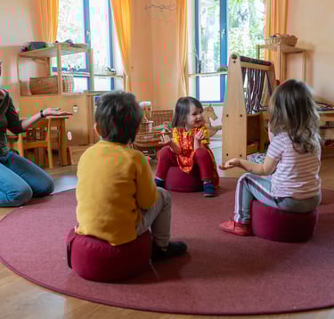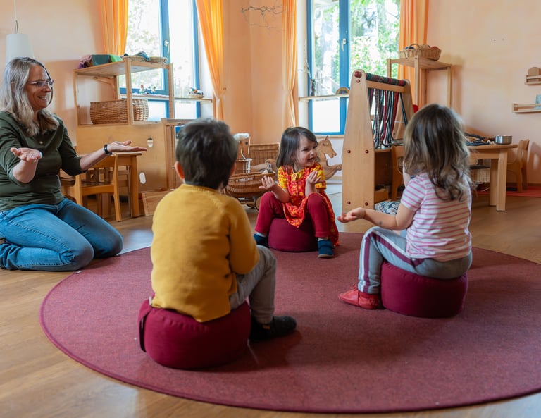 In der Waldorfpädagogik spielen Rhythmus und Wiederholung eine besonders wichtige Rolle. Ein regelmäßiger Ablauf des Tages, der Woche und des Jahres gibt unseren Kindern Sicherheit, Geborgenheit und Vertrauen. Durch einen rhythmischen, gleichbleibenden Tagesablauf und feste Bezugspersonen schaffen wir eine stabile Umgebung, in der sich die Kinder wohlfühlen. Zusätzlich fördern Lieder, Reime, Fingerspiele, kleine Geschichten und die direkte persönliche Ansprache die sprachliche Entwicklung der Kinder.